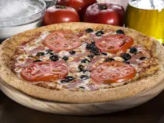 Masa fresca, salsa de tomate especiada, mozzarella 100%, tomate natural, aceitunas negras, jamón York, atún y orégano