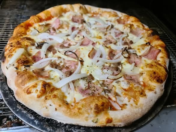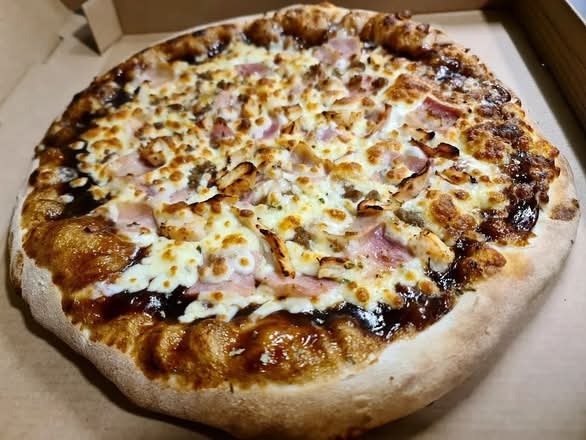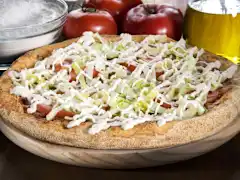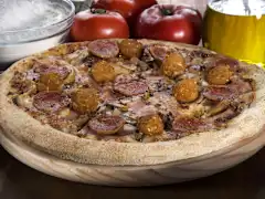 Masa fresca, salsa barbacoa,mozzarella 100%, carne de ternera, doble de bacon ahumado,pollo y orégano.
