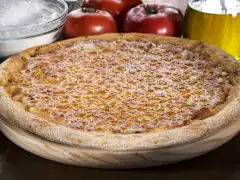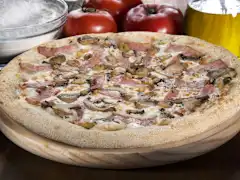 Masa fresca, salsa carbonara, mozzarella 100%, doble de Bacon ahumado, cebolla, champiñones y orégano