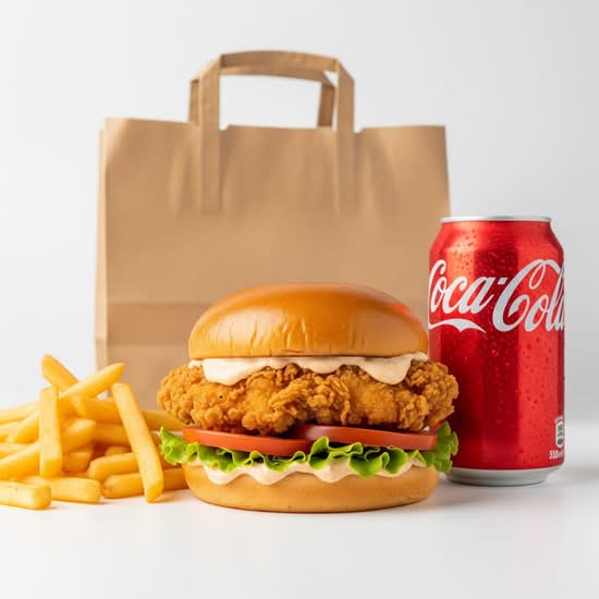 Hamburguesa de Pollo con Patatas y Bebida 33CL