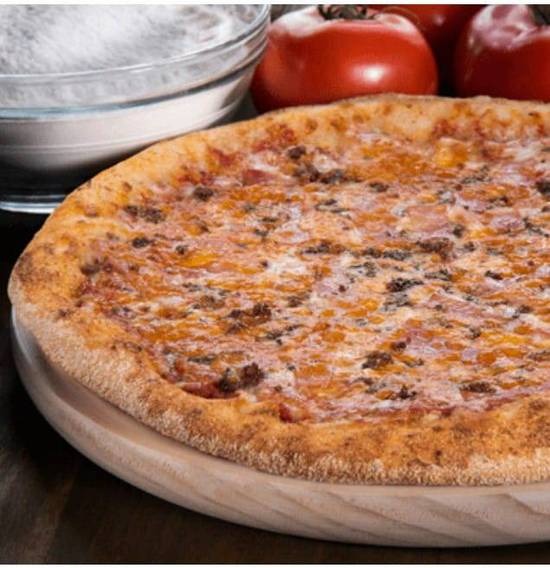 Masa fresca, salsa de tomate especiada, mozzarella 100%, beicon ahumado, ternera picada, queso cheddar y orégano.