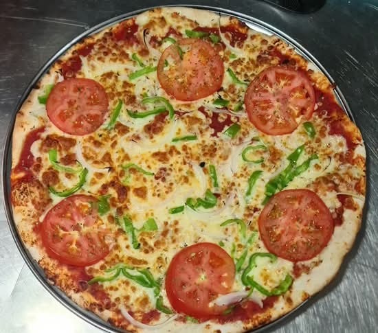 Masa fresca,salsa de tomate, queso mozzarella, ternera, cubitos de pollo, bacon, pimiento verde, cebolla y orégano.