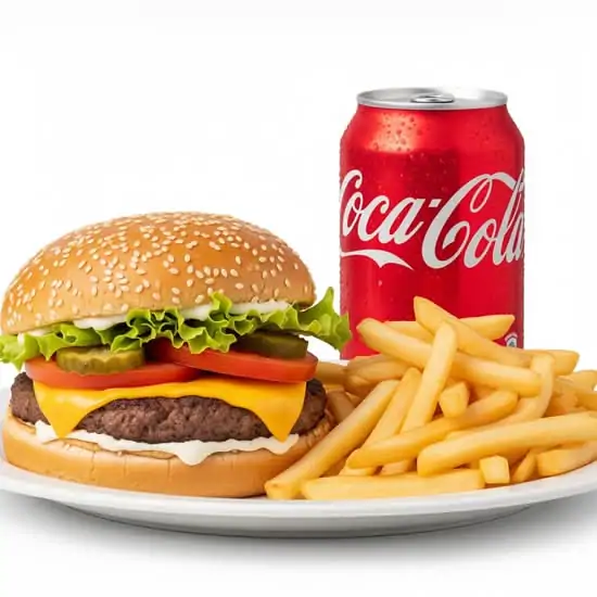 Hamburguesa de carne de ternera sencilla. más patatas fritas y bebida refresco en lata de 33cc o botellín de agua.
