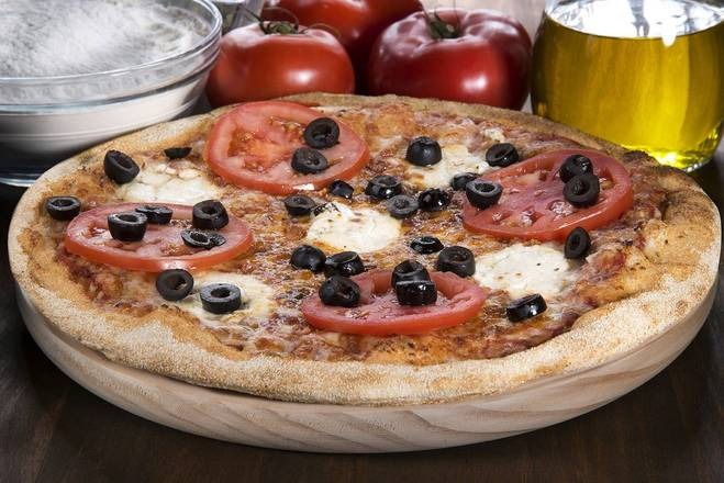 Queso vegano de origen vegetal, salsa de tomate especiada, aceitunas negras, tomate natural, cebolla, pimiento verde y orégano.
