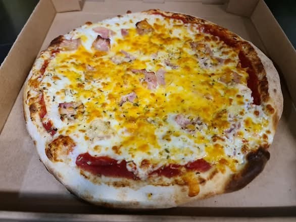 Masa fresca,salsa carbonara, mozarela, jamón york, bacon, y orégano.