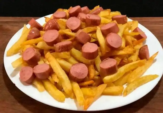 Patatas fritas, salchicha tipo frankfurt en rodajas.